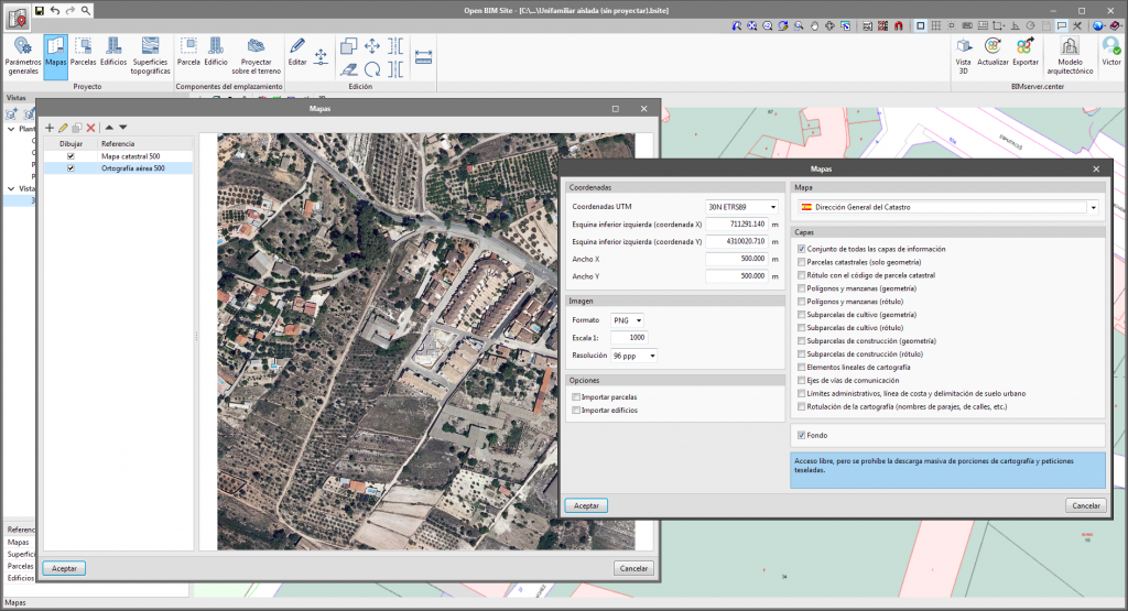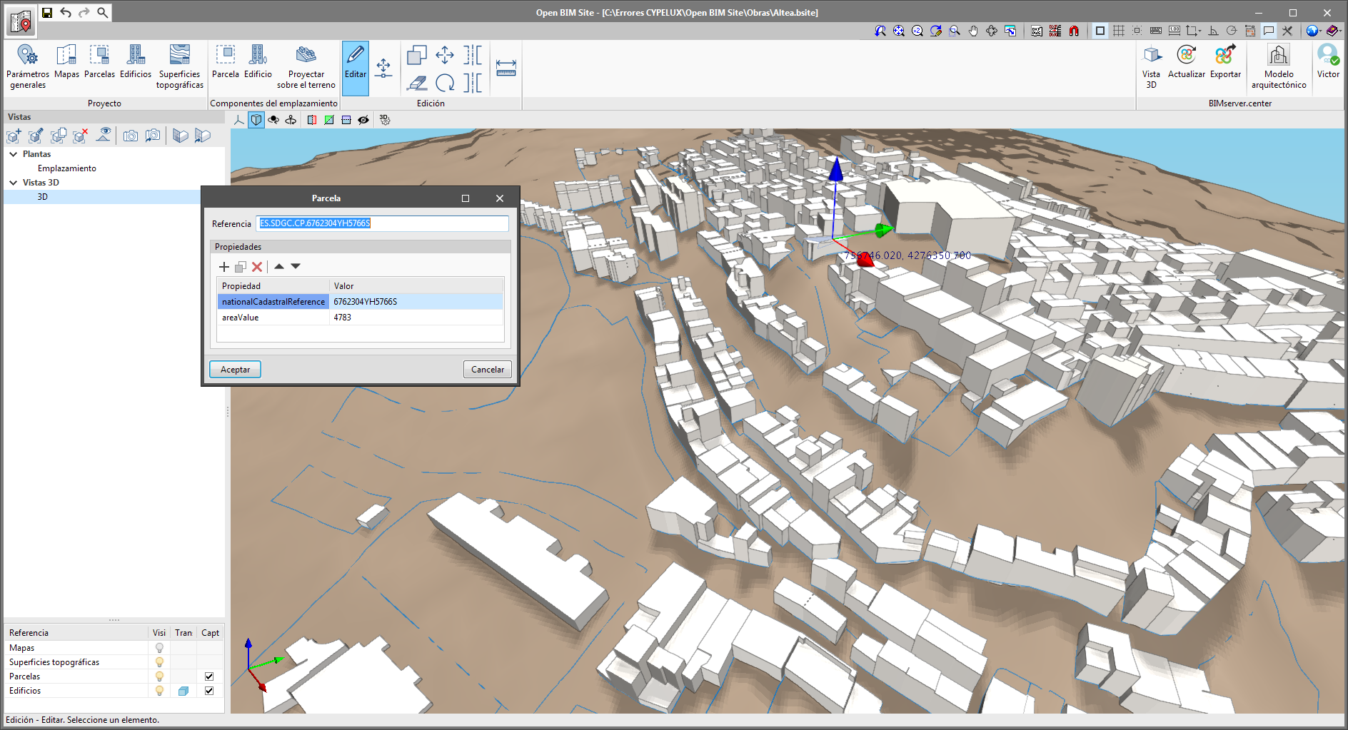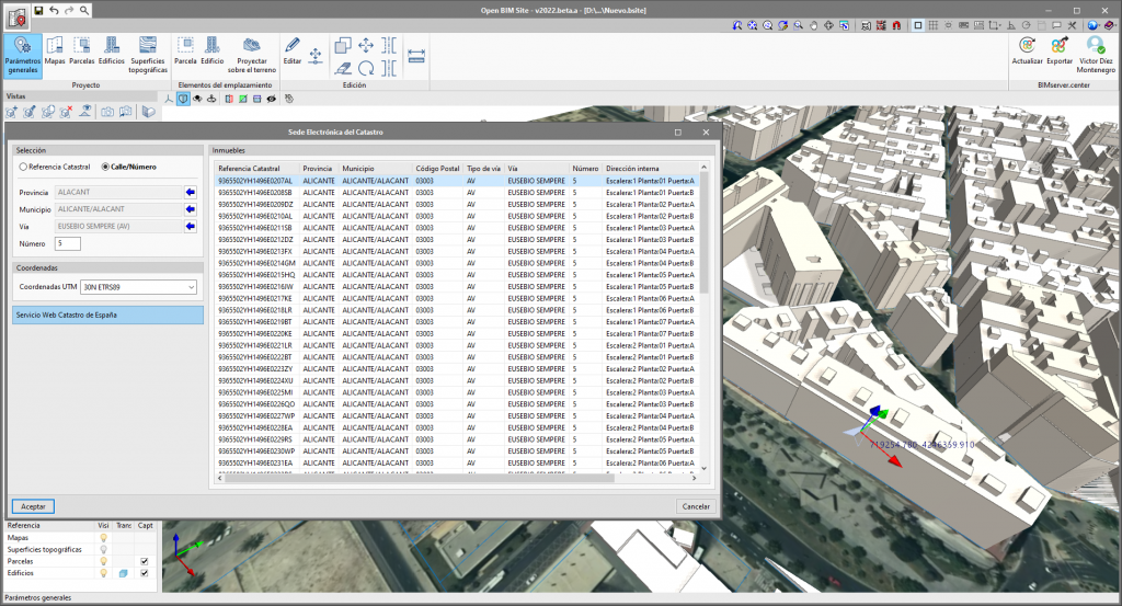 Open BIM Site incorpora una utilidad para obtener los datos del emplazamiento a través de la conexión con los servicios web libres de la Sede Electrónica del Catastro de España.