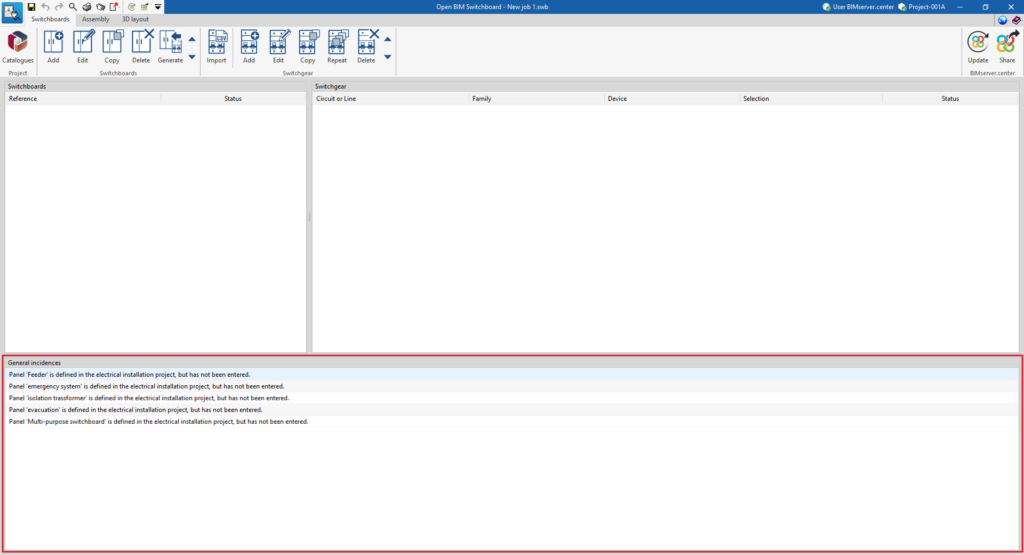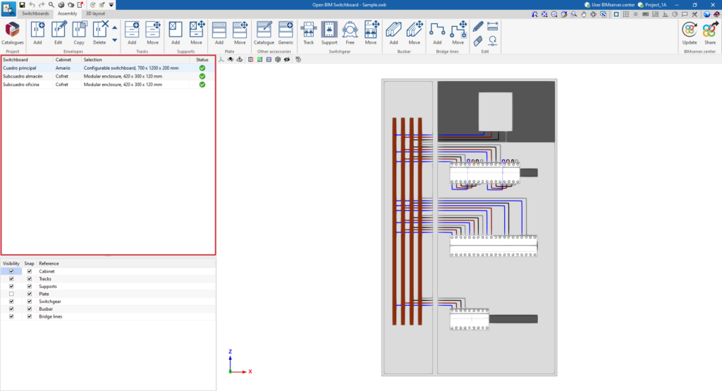 Si se vincula la obra de Open BIM Switchboard a un proyecto BIM de la plataforma BIMserver.center, es posible importar los cuadros y subcuadros eléctricos de la instalación, junto con la aparamenta de cada uno de ellos, incluyendo la definición de embarrados y líneas puente a partir de la información leída del modelo BIM. Una vez generados los cuadros y subcuadros, pueden modificarse utilizando las herramientas correspondientes sin ningún tipo de restricción. Entre las opciones disponibles se encuentran las siguientes: