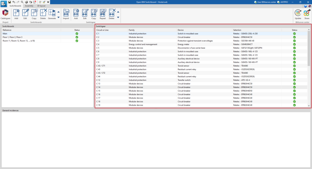 El programa incorporará la información del proyecto eléctrico leída a partir del modelo BIM. Después, en la pestaña "Cuadros", se pueden crear cuadros y aparamenta que se correspondan con la información leída, o generarlos automáticamente.