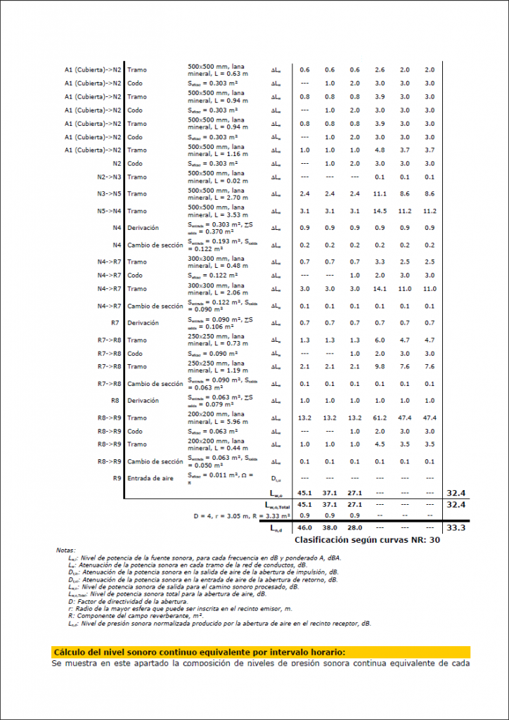 En este cálculo de inmisión sonora se resuelven todos los caminos posibles del sonido que confluyen en cada una de las aberturas del sistema de conductos, procesando la atenuación sonora de la red en las bandas de octava de 125 Hz a 4000 Hz, y tomando los valores de absorción sonora de cada producto y fabricante concreto, desde el Generador de precios. Para cada rejilla se calcula también el nivel sonoro según curvas de confort NR (usadas normalmente en el diseño acústico de salas y recintos), y el valor final ponderado A, que pasa a sumar ruido con el resto de aberturas y equipos de cada recinto.