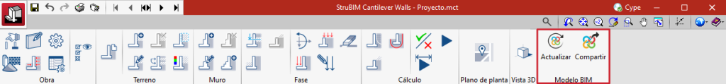 Mediante el botón “Compartir” se puede exportar a BIMserver.center la información contenida en el modelo desarrollado con StruBIM Cantilever Walls.