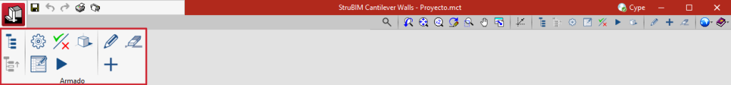 Dentro de la pestaña "Armado", en el bloque "Armado" de la barra de herramientas principal se disponen las opciones necesarias para consultar el armado dispuesto, realizar modificaciones sobre el mismo y comprobar su cumplimiento o realizar un redimensionado automático.