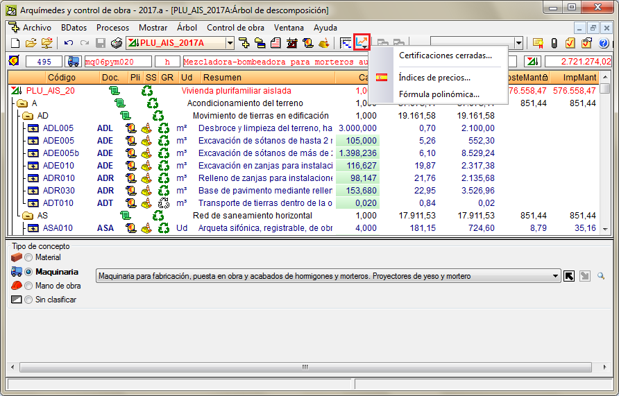 Hasta la versión 2016.n de Arquímedes, los conceptos unitarios podían ser clasificados según los tipos o naturalezas "Material", "Mano de obra", "Maquinaria" y "Sin clasificar".