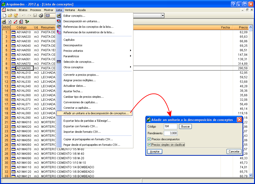 Se ha implementado la opción Añadir un unitario a la descomposición de conceptos para un banco de precios (ventana Lista de conceptos > menú Mostrar > Lista de conceptos). Esta opción ya estaba disponible en versiones anteriores para un presupuesto.