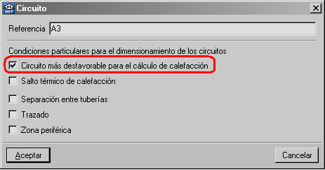 Además, en la versión 2014.d se ha implementado la posibilidad de que sea el usuario el que determine, según su criterio, cual es el circuito más desfavorable, lo que determinará el cálculo de las temperaturas de impulsión. De este modo, el usuario puede tener un mayor control sobre el cálculo de la instalación. La selección del circuito más desfavorable se realiza en la edición del circuito elegido.