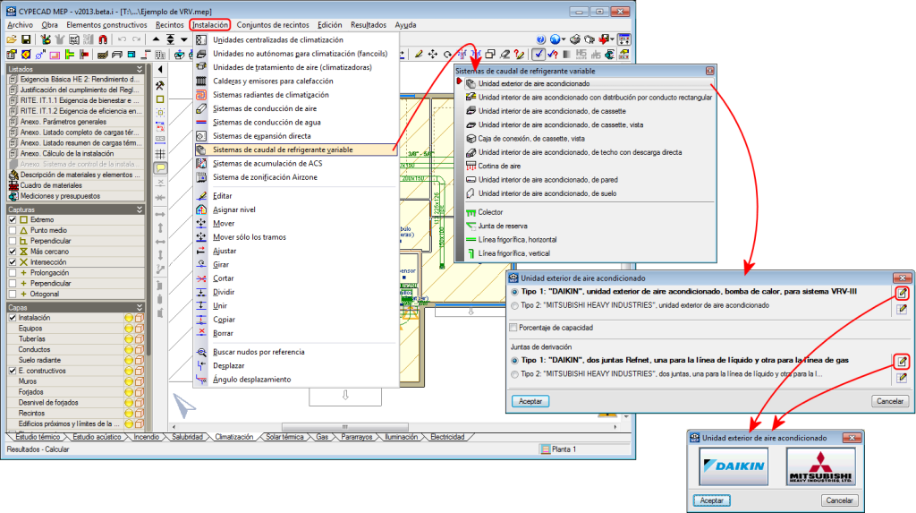 La versión 2013.i de CYPECAD MEP incluye en su solapa Climatización el diseño, el cálculo y el presupuesto de instalaciones de caudal de refrigerante variable (VRF) de Mitsubishi Heavy Industries. De esta forma, el sistema VRF de Mitsubishi Heavy Industries se une al sistema de volumen de refrigerante variable (VRV) de DAIKIN que estaba implementado desde la versión 2012.a (menú Instalación > Sistemas de caudal de refrigerante variable > Selección de un elemento de la instalación > incluirlo en la biblioteca o editarlo > Seleccionar el fabricante).
