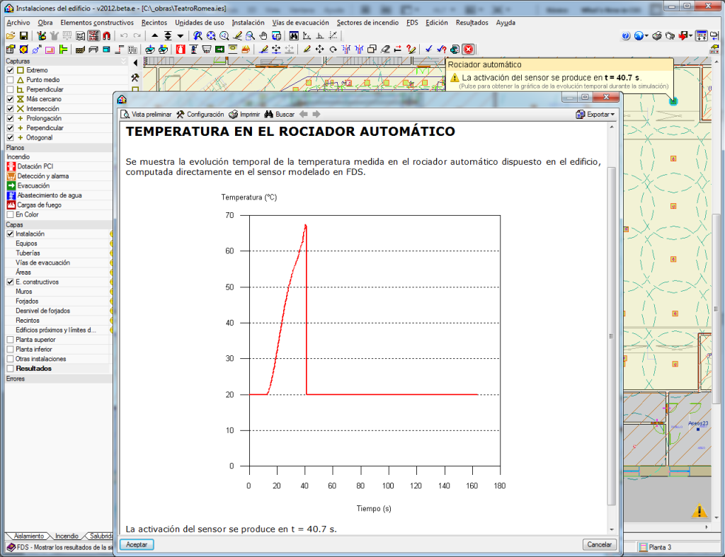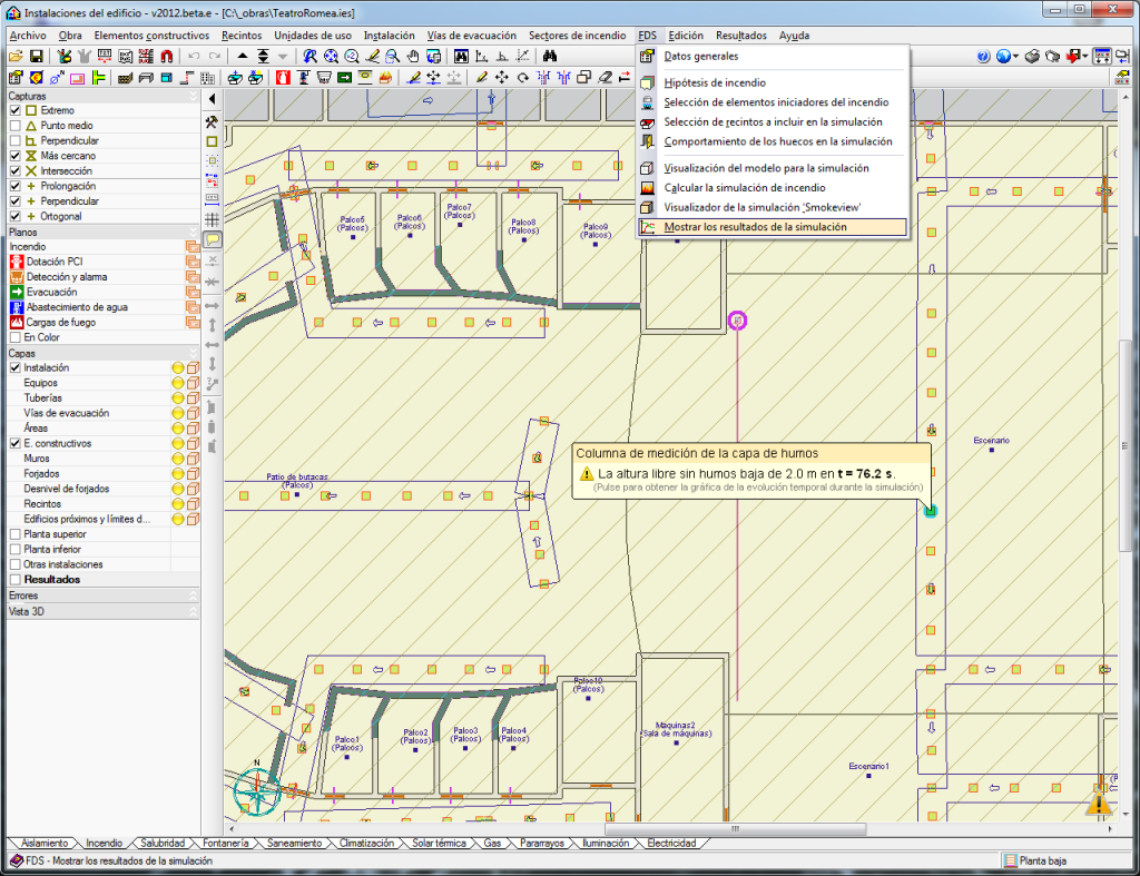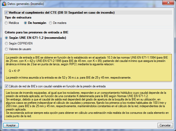 En los cálculos hidráulicos de la red a presión para el abastecimiento de bocas de incendio equipadas y rociadores automáticos, es posible a partir de la v.2012.e calcular las bocas de incendio asumiendo un caudal fijo a cada elemento sin importar su presión de entrada calculada (con 100 l/min y 200 l/min para BIE’s de 25 mm y 45 mm, respectivamente), o bien procesar el caudal de cada elemento en función de la presión de suministro, según la relación Q=K·√P que gobierna su comportamiento hidráulico, según las Normas de producto EN 671 partes 1 y 2, de igual forma que se calculan las redes de rociadores según EN 12845.