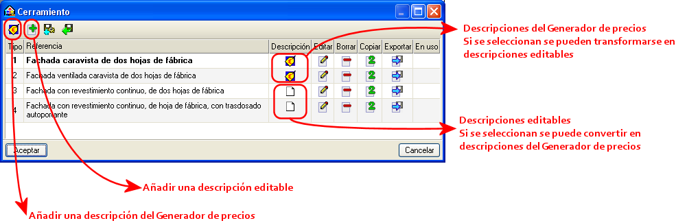 Si el usuario desea introducir un elemento constructivo que no esté definido en el Generador de precios, pero que es similar a alguno de los disponibles, puede importarlo y después convertirlo a una descripción editable para modificar lo que desee. De este modo, se importan también todos los parámetros que incluye la descripción del Generador de precios, aunque sea el usuario el que tendrá que comprobar si los cambios que realice afectan a los parámetros importados y modificarlos si lo considera necesario.