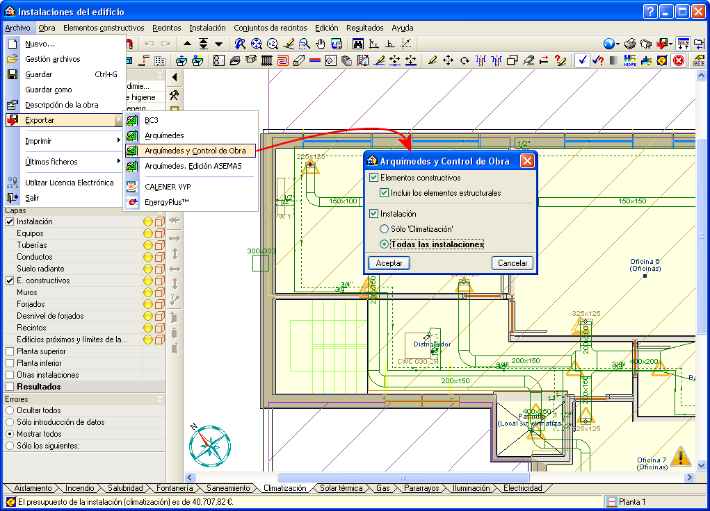 Si el usuario mantiene la conexión con el Generador de precios podrá generar automáticamente el presupuesto y la medición de los elementos constructivos (además de los de las instalaciones dimensionadas por el programa si se desea) para exportarlo a Arquímedes o al formato FIEBDC-3 (Formato de Intercambio Estándar de Bases de Datos de la Construcción). Esto permite obtener el presupuesto completo del edificio. Además, los presupuestos generados con la información del Generador de precios incluyen automáticamente unidades de obra con completas descripciones; criterios de medición; desgloses minuciosos en maquinaria, materiales y mano de obra; coste de mantenimiento decenal; instrucciones sobre uso y mantenimiento; residuos generados; datos para realizar análisis del ciclo de vida de los materiales empleados; etc.Para generar el presupuesto y la medición de los elementos constructivos y de las instalaciones dimensionadas por el programa es necesario que la Conexión con el Generador de precios esté incluida en la licencia de uso del programa. Además, la información que se incluya en el presupuesto generado depende también de los permisos que cada usuario disponga en su licencia.