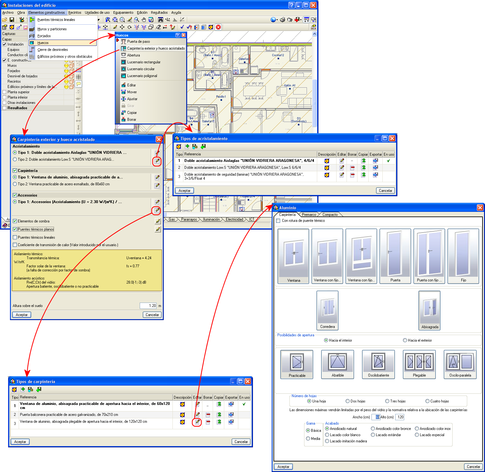 En versiones anteriores para introducir una ventana se definía el acristalamiento, la carpintería, los accesorios (protecciones exteriores e interiores, persiana, persiana veneciana y cortinas), los elementos de sombra, los puentes térmicos planos y lineales, y el coeficiente de transmisión de calor. Las ventanas definidas se podían guardar en una biblioteca para utilizarlas en cualquier obra. Si en una obra existían ventanas con diferente acristalamiento o carpintería, debían existir diferentes tipos de ventanas y en las bibliotecas también.