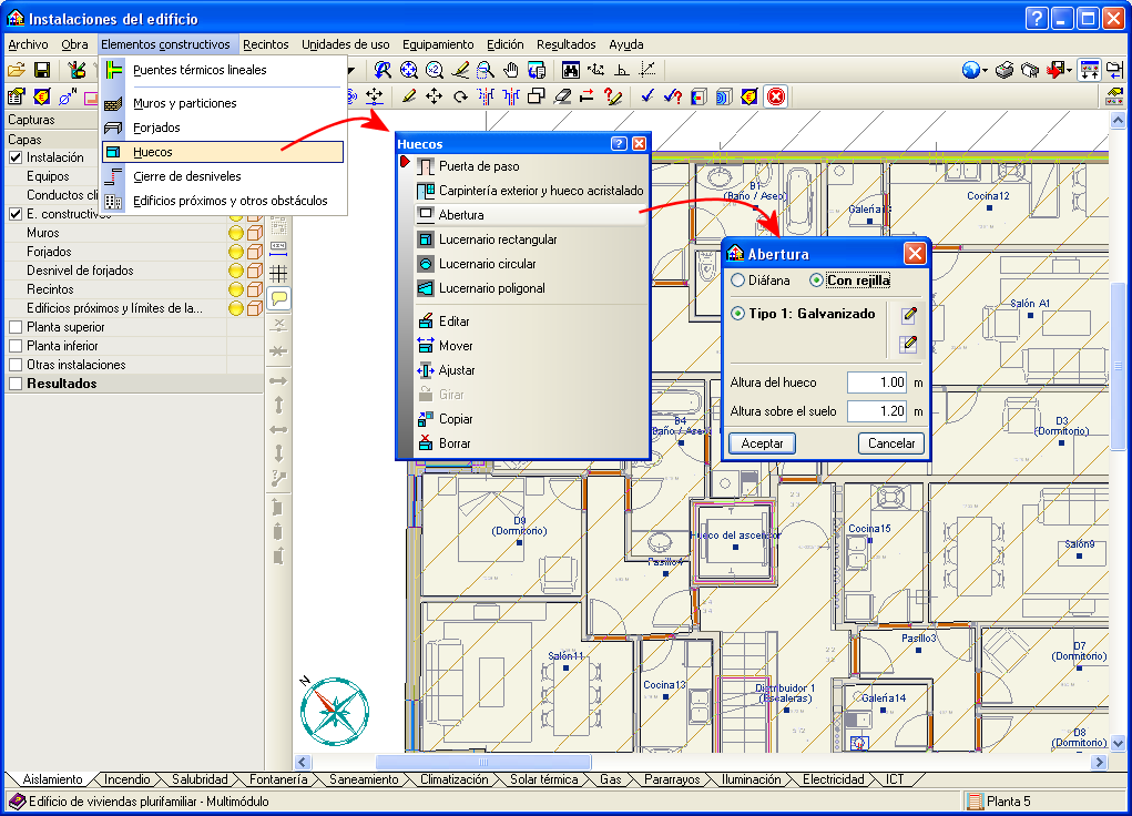 En el menú Elementos constructivos > Huecos, se ha implementado la opción Aberturas, que permite al usuario definir huecos diáfanos o con rejilla. Esta posibilidad permite que el modelo del edificio introducido en el programa pueda ser analizado con mayor detalle. Por ejemplo, permite al módulo Electricidad comprobar si las aberturas dispuestas permiten considerar un garaje como aparcamiento abierto y por tanto, poder desclasificarlo como local de alto riesgo de incendio o explosión.