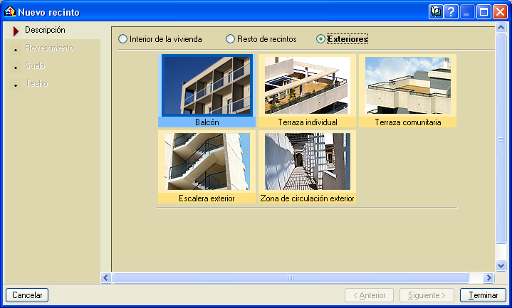 La versión 2012.a de Instalaciones del edificio incluye un nuevo tipo de recintos, los Recintos exteriores (Balcón, Terraza individual, Terraza comunitaria, Escalera exterior y Zona de circulación exterior). Son recintos delimitados en alguno de sus lados por barandillas, antepechos, balaustradas.