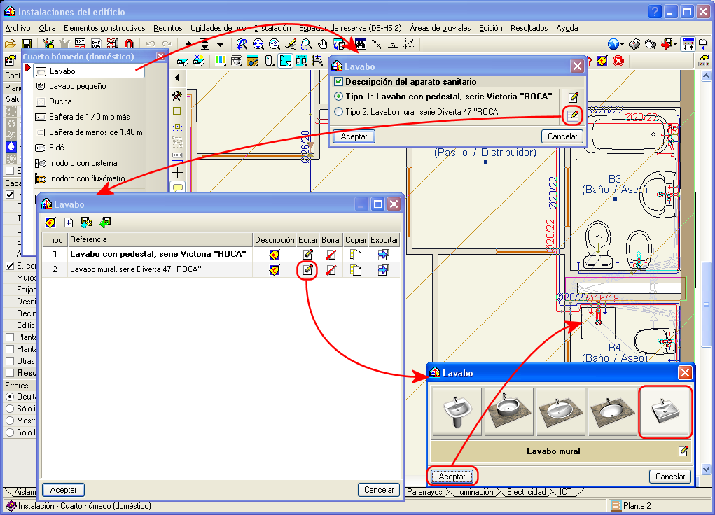 El usuario define las dimensiones del aparato sanitario y el programa introduce automáticamente su consumo. Las dimensiones se visualizan en pantalla, lo que permite conocer a simple vista el espacio que va a ocupar. Existen dos modos de describir los aparatos sanitarios:
