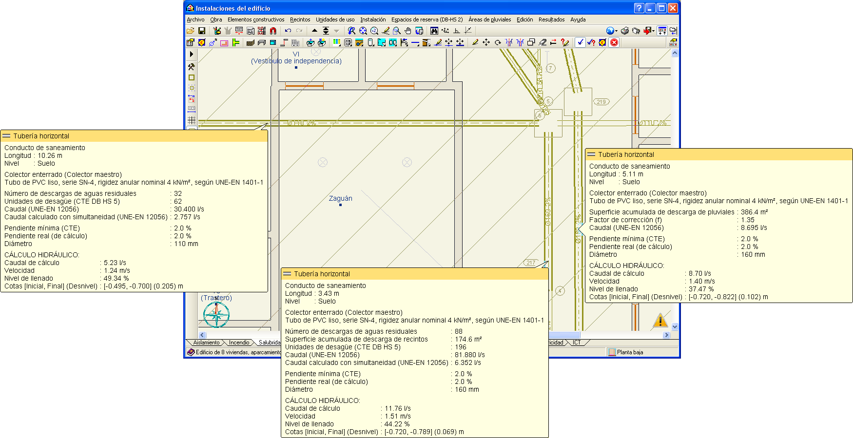 Se ha mejorado el proceso de cálculo del número de salidas de planta disponibles para cada evacuación del edificio. Ahora el algoritmo de detección de salidas disponibles es más eficiente y ya no requiere que el usuario defina vías de evacuación extra (que no dibujaría en los planos de evacuación) para conectar cada posible recorrido. De esta forma, en edificios complejos con recintos, plantas o zonas con varias salidas de evacuación, los recorridos se evalúan sin problemas, manteniendo unos planos de evacuación sencillos y aptos para su representación gráfica.
