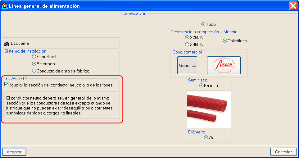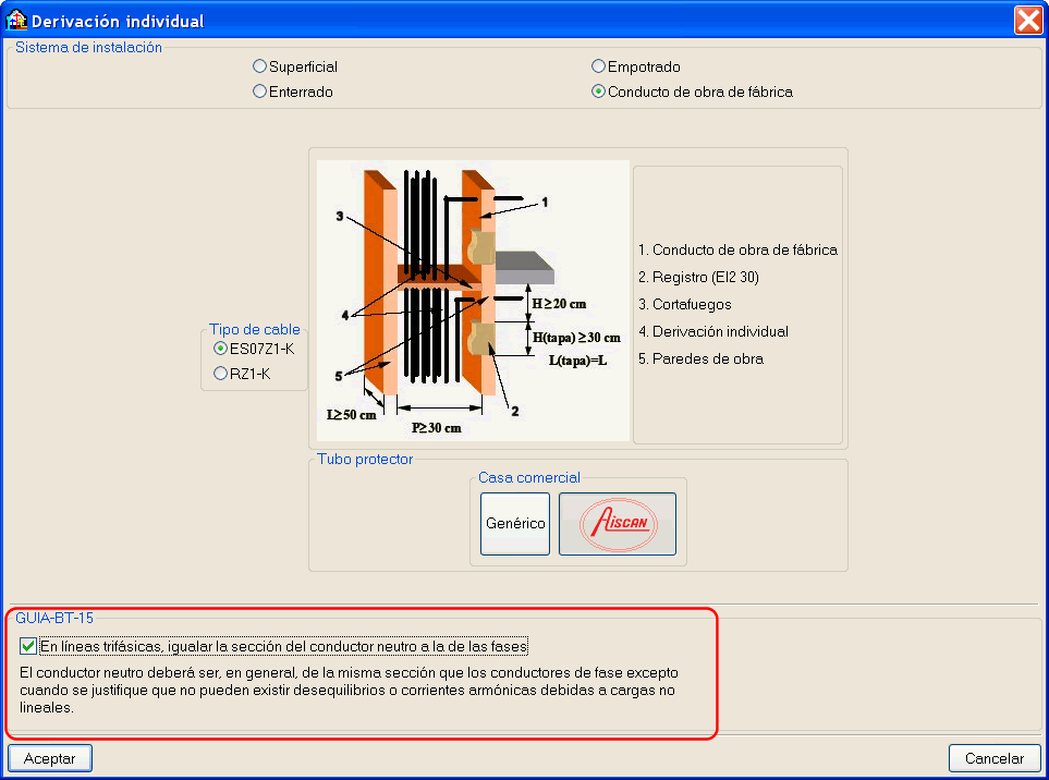 En la línea general de alimentación y en las derivaciones individuales se puede igualar la sección del conductor neutro a la sección de las fases. Esta situación cumple con la GUIA-BT-14 y la GUIA-BT-15.