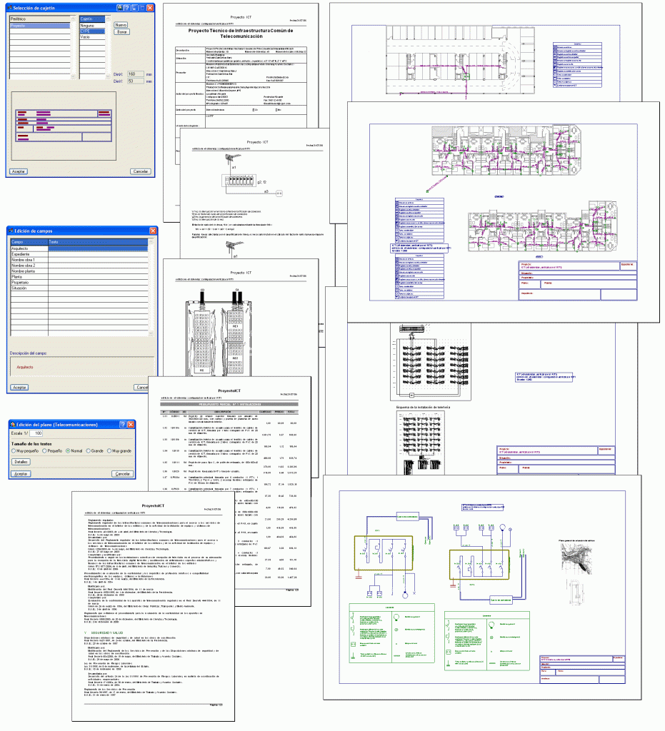 - Gestión de planos: El programa incorpora en la generación del documento de proyecto ICT una completa gestión de los planos que permite al proyectista introducir su propio cajetín, incorporar a los planos todo tipo de detalles, seleccionar la escala y tamaño del papel, y realizar el montaje preliminar de los planos. De esta forma, el programa incorpora automáticamente los planos en el documento del proyecto sin necesidad de utilizar una herramienta informática complementaria.