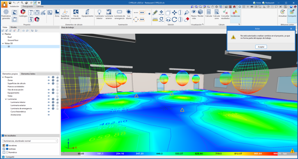 A partir de la versión 2025.d, cuando se pulsa el botón "Compartir" de las aplicaciones (antes de comenzar la generación de los ficheros de la aportación) se comprueba que el usuario forma parte del equipo de trabajo del proyecto de BIMserver.center. En caso de que el usuario no tenga los permisos adecuados, se muestra un mensaje de advertencia. De esta forma, se evita la generación de archivos innecesarios cuando el usuario no tiene derechos de edición.