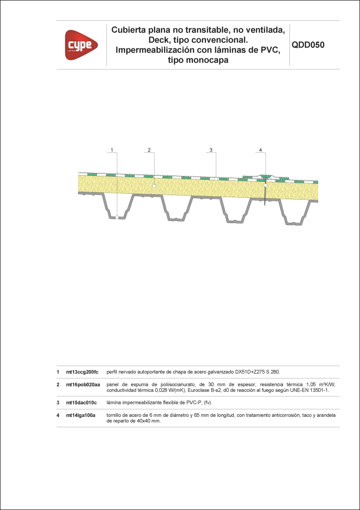 - QDD050. Cubierta plana no transitable, no ventilada Deck, tipo convencional. Impermeabilización con láminas de PVC, tipo monocapa.