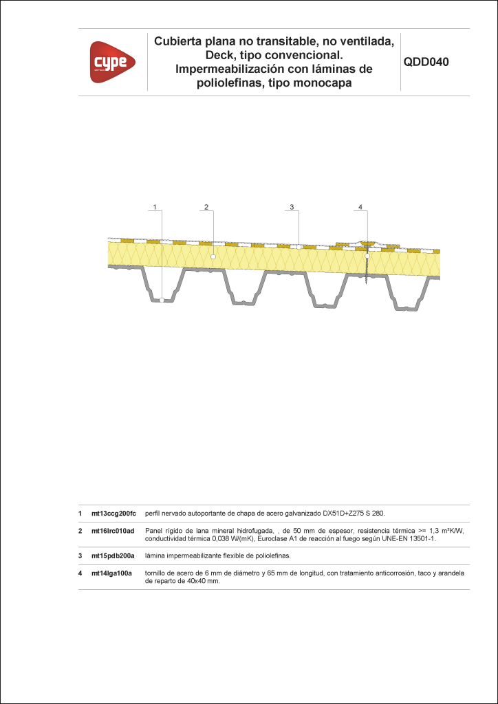 - QDD040. Cubierta plana no transitable, no ventilada, Deck, tipo convencional. Impermeabilización con láminas de poliolefinas, tipo monocapa.