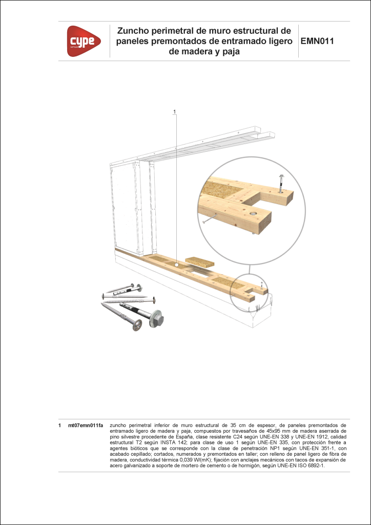 - EMN011. Zuncho perimetral de muro estructural de paneles premontados de entramado ligero de madera y paja.