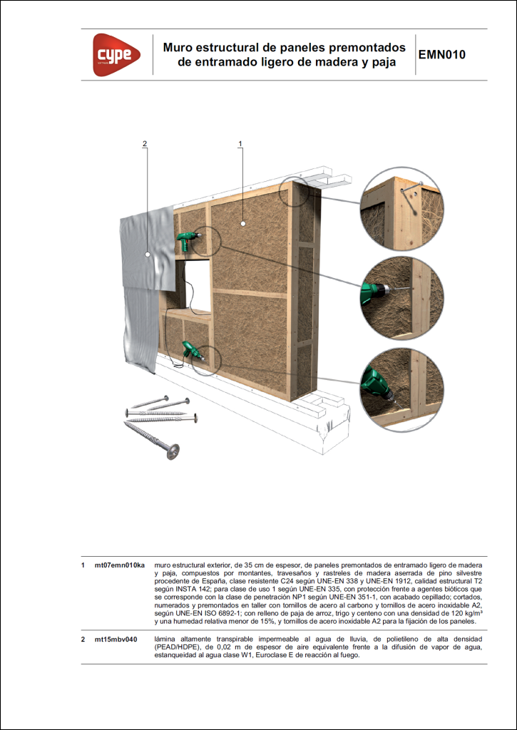 - EMN010. Muro estructural de paneles premontados de entramado ligero de madera y paja.