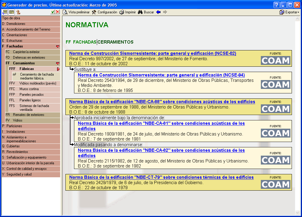 La nueva versión del Generador de Precios de la Construcción muestra la normativa de aplicación de carácter general y específica relacionada con cada capítulo, subcapítulo y apartado.