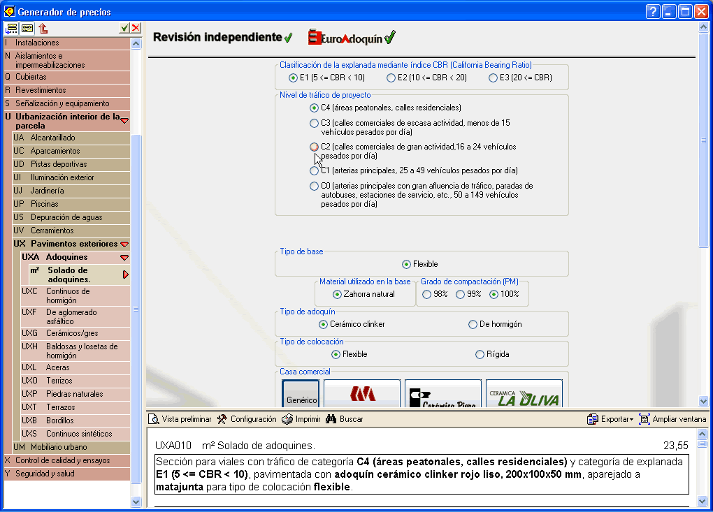 También han sido revisadas por EuroAdoquín las partidas pertenecientes al apartado UXA (Adoquines), por Tecnopavimento las partidas pertenecientes a los apartados UXH (Baldosas y losetas de hormigón) y UXT (Terrazos), y por parte de ABENOR partidas de UXB (Bordillos). Esta revisión conlleva, en la mayor parte de los pavimentos exteriores, que la posibilidad de elección de algunos de sus componentes (tipo de base, tipo de baldosa, material de colocación, tipo de junta, mortero para juntas, etc.) dependa del uso y del tránsito que vaya a tener el pavimento.