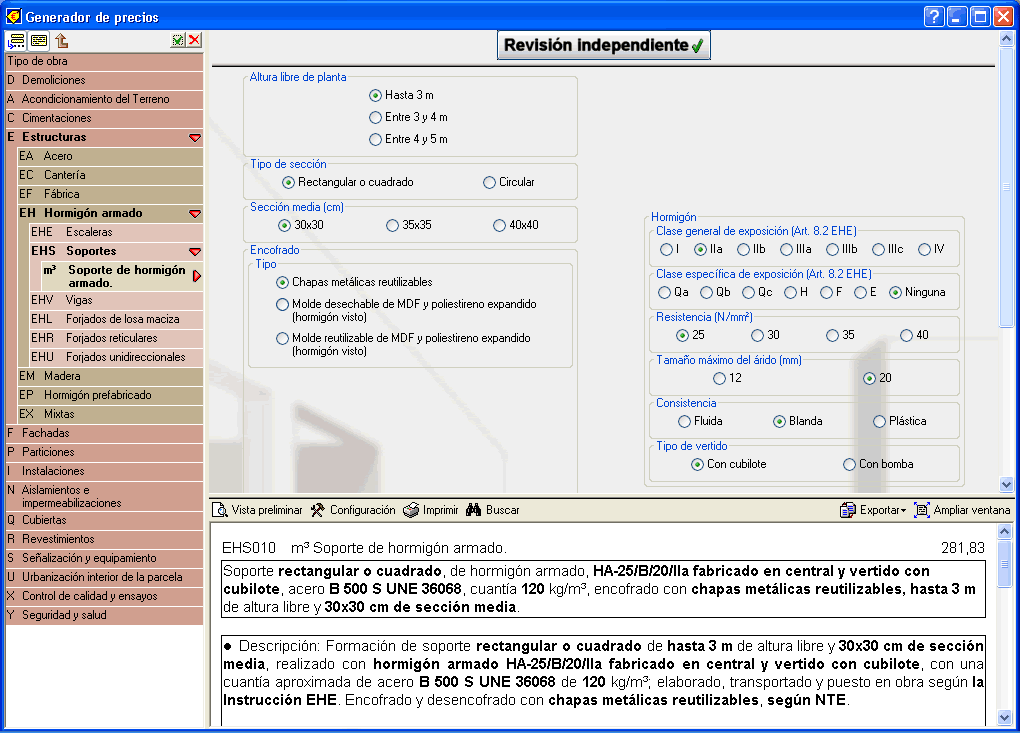 Dentro del Generador de Precios también dispone de esta información a la que podrá acceder seleccionando el botón "Revisión Independiente" que encontrará en la parte superior de la pantalla del Generador de Precios cuando se muestran partidas que la contienen.