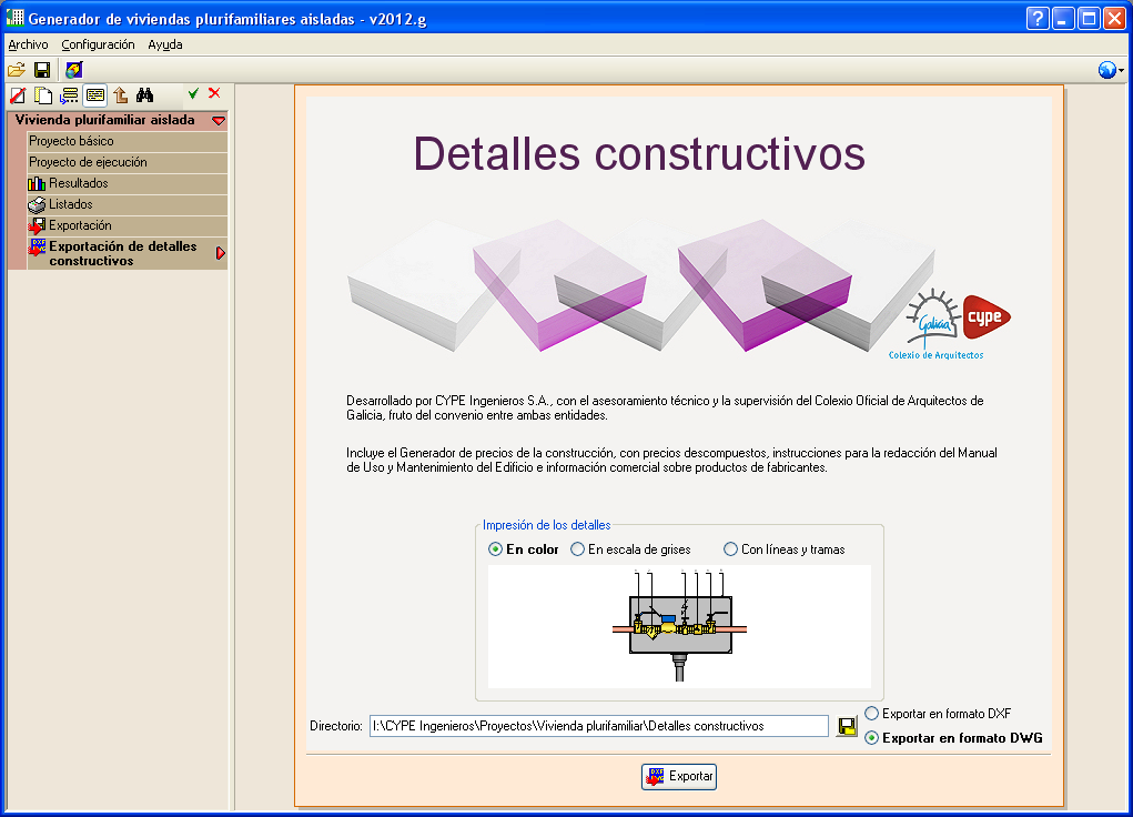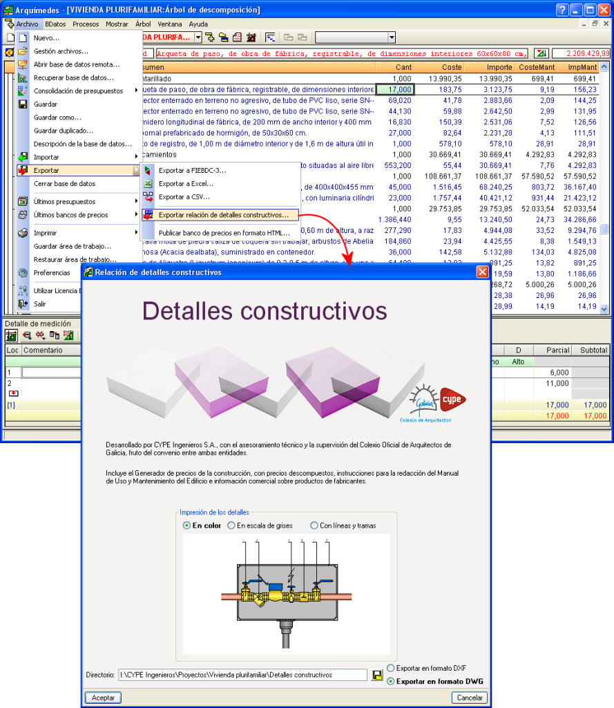 El módulo Detalles constructivos, Suministro y evacuación de aguas permite al Generador de precios de la construcción, al Generador de precios de rehabilitación a los Generadores de presupuestos y a Arquímedes generar detalles constructivos de suministro y evacuación de aguas adaptados minuciosamente a la selección de parámetros realizada en el Generador de precios.