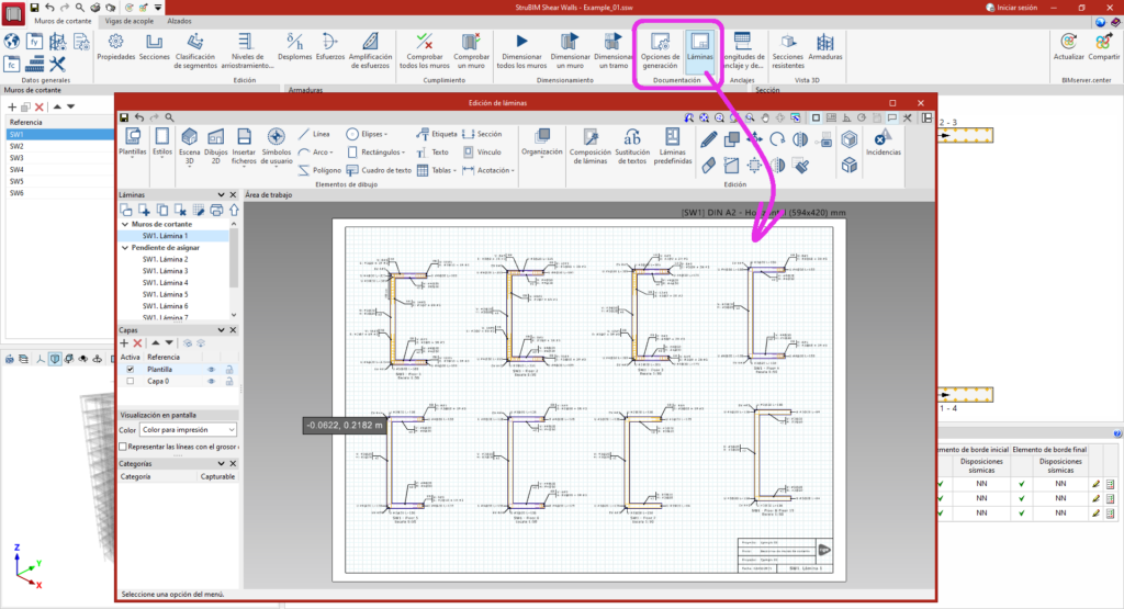 En la versión 2026.a de StruBIM Shear Walls se incorporan herramientas que permiten la generación automática o manual de planos con los alzados de los muros de cortante diseñados en el programa, lo que facilita la documentación gráfica de los diseños realizados.