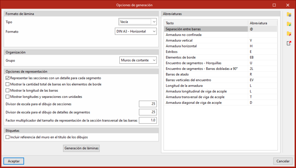 La primera vez que se ingresa a esta sección, el programa pregunta si se desea generar automáticamente la composición predefinida de láminas. Si se responde afirmativamente, se crea una lámina para cada sección del muro. La representación de cada lámina dependerá de la configuración seleccionada en "Opciones de generación", pudiendo mostrar un dibujo detallado de toda la sección o un esquema general con detalles específicos para cada segmento.