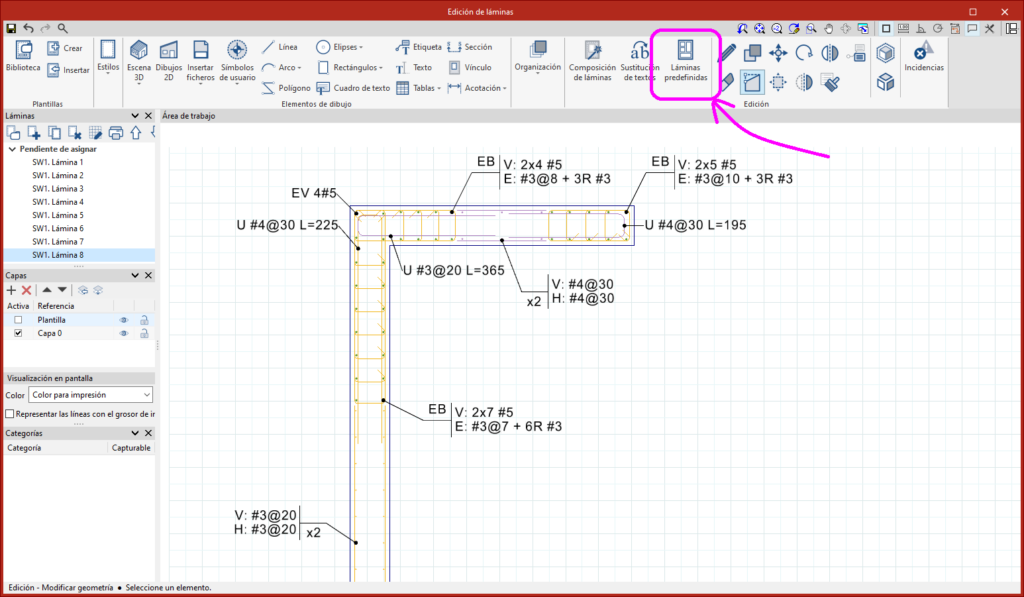 Al hacer clic en el icono "Láminas" dentro del grupo de botones "Documentación", se accede al editor de láminas del muro seleccionado.