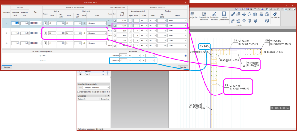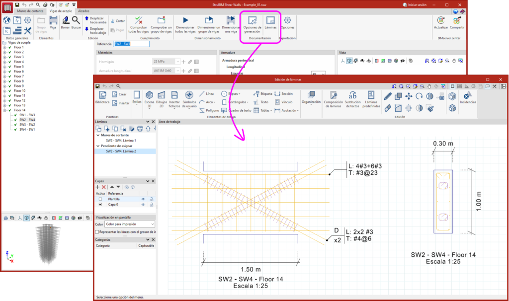 En la versión 2025.d de StruBIM Shear Walls se incorporan herramientas que permiten la generación automática o manual de planos con las secciones de los muros de cortante diseñados en el programa, lo que facilita la documentación gráfica de los diseños realizados.