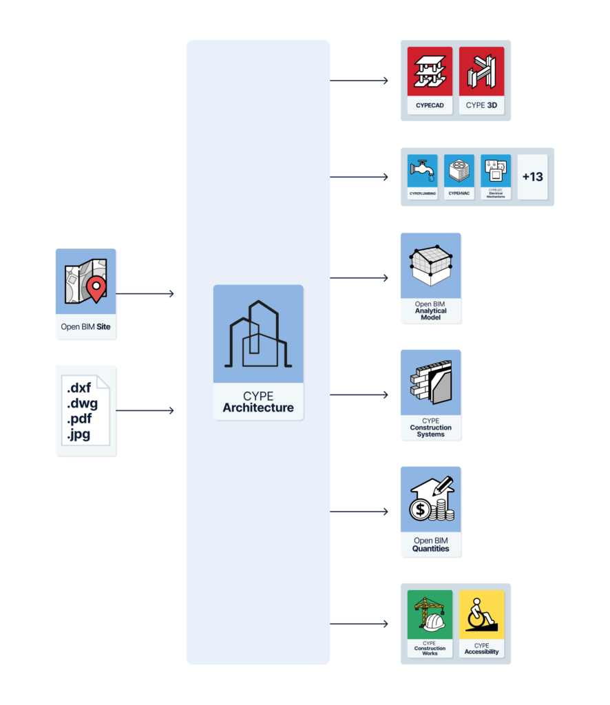 CYPE Architecture, al ser una herramienta Open BIM de modelado arquitectónico y estar conectada a la plataforma BIMserver.center, ofrece diferentes opciones de flujo de trabajo.