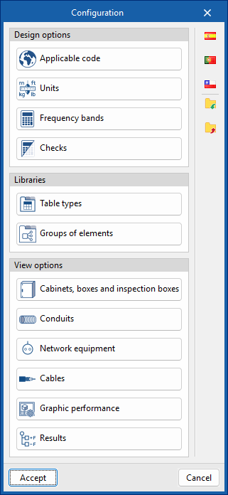- En la parte superior, todas las herramientas necesarias para gestionar los catálogos y configurar el proyecto; introducir y editar los esquemas de la instalación de telecomunicaciones; y realizar el cálculo y la comprobación de la instalación.