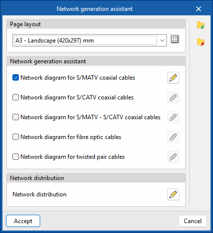 - Gestión y generación de esquemas de redes de telecomunicaciones para las distintas tecnologías (pestaña "Esquemas: Cálculo", bloques "Cable coaxial", "Fibra óptica" y "Pares de cobre"). Puede hacerse de dos formas: