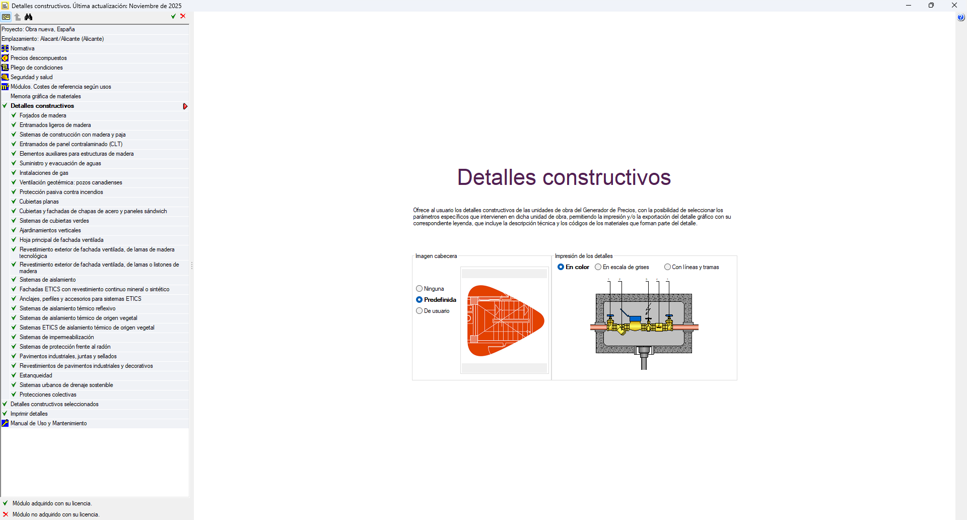 Los detalles constructivos del Generador de precios están agrupados en diferentes módulos. Los programas de CYPE que pueden imprimir o exportar estos detalles en función de los permisos adquiridos en la licencia de usuario, son: Generador de precios, Arquímedes, Generadores de presupuestos y Detalles constructivos.