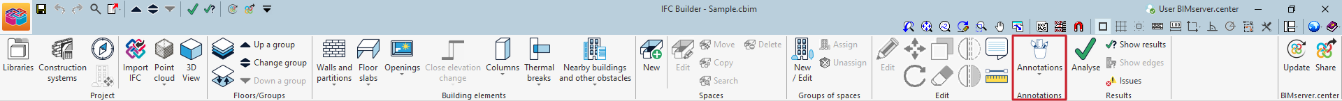 En el bloque “BIMserver.center" de la barra de herramientas principal se encuentran las funcionalidades necesarias para utilizar IFC Builder junto a otras herramientas de BIMserver.center: