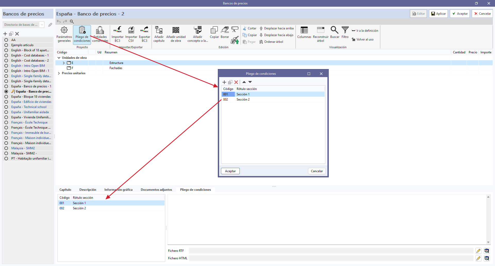 Para añadir las secciones al pliego, previamente se debe pulsar el botón "Pliego de condiciones", dentro del bloque "Proyecto" de la barra de herramientas del panel de gestión de bancos de precios y de la base de datos del proyecto.