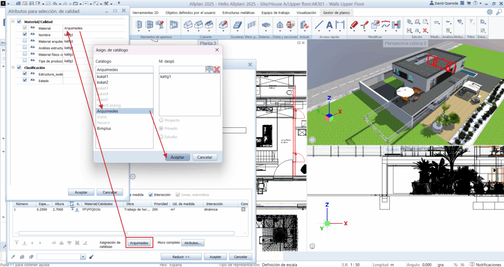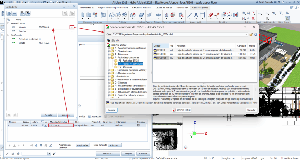 Durante el modelado en Allplan, es posible asignar manualmente a cada elemento (muro, forjado, etc.) el código de una partida perteneciente a un presupuesto de Arquímedes.