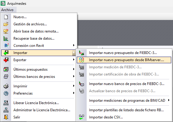 Esta opción se encuentra en el apartado "Importar" del menú "Archivo". Permite importar y consolidar varios ficheros BC3 procedentes de un proyecto de BIMserver.center en un único presupuesto.