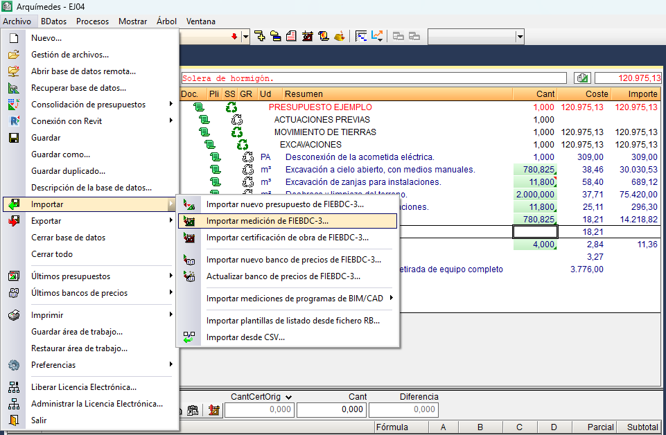 Se puede importar una medición contenida en uno o más ficheros .bc3, sobre el presupuesto actual, por medio de la opción "Importar medición de FIEBDC-3", del apartado "Importar" del menú "Archivo".
