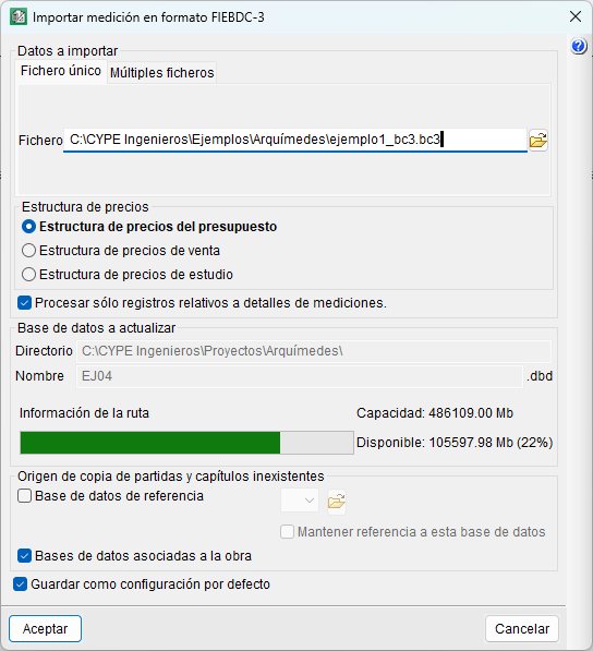 En el diálogo que se abre aparecen dos posibilidades, que la medición se componga de un solo fichero .bc3 (pestaña "Fichero único") o de múltiples ficheros (pestaña "Múltiples ficheros"). El proceso de importación comienza seleccionando la ubicación del fichero o ficheros, debiendo indicar la estructura (presupuesto, venta o estudio) que recibirán los precios. Opcionalmente, pueden incluirse solamente registros relativos a detalles de mediciones.