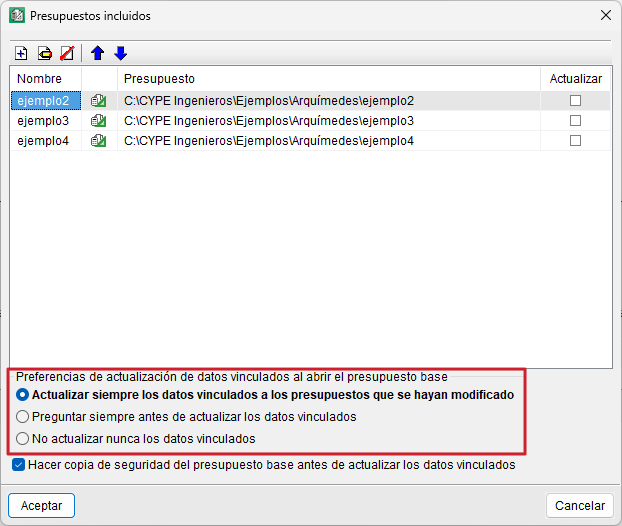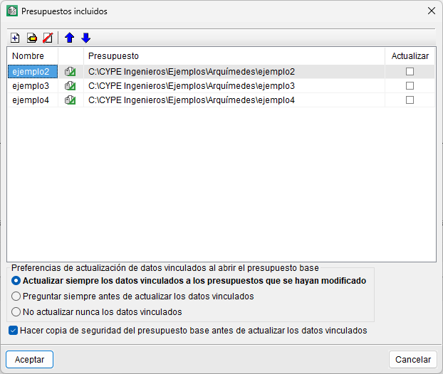 Cada vez que se abre el presupuesto base, Arquímedes actualiza las unidades de obra vinculadas a otros presupuestos (sólo de los presupuestos modificados desde la última actualización). Esta actualización se realiza de acuerdo con la opción seleccionada en el diálogo "Presupuestos incluidos" (menú "Archivo", "Consolidación de presupuestos", "Mostrar presupuestos incluidos").