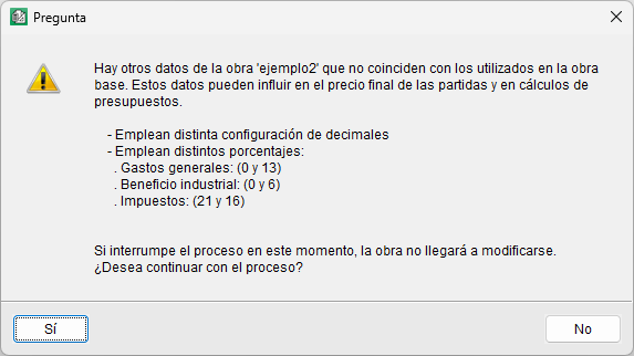 Cuando se importa un presupuesto en el presupuesto base, es lógico que ambos tengan la misma configuración, y que los conceptos importados provengan del mismo banco de precios y en las mismas condiciones. Es decir, en ambos presupuestos el número de decimales y los porcentajes empleados deben ser los mismos, los unitarios que se repiten deben ser iguales (descripción y coste), y las unidades de obra que tengan el mismo código también deben coincidir (tanto en su descomposición como en los rendimientos de sus unitarios). En el caso de utilizar el Generador de precios de CYPE, la configuración adoptada para ambos presupuestos (tipo de edificio, situación, accesibilidad, topografía, situación económica del mercado, etc.) también debe ser la misma.