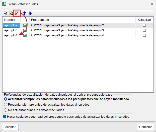 En el diálogo "Presupuestos incluidos" (menú "Archivo", "Consolidación de presupuestos", "Mostrar presupuestos incluidos") el botón "Suprimir elemento seleccionado de la lista" permite eliminar la conexión con el presupuesto que esté seleccionado en la lista, lo que desvinculará todas las unidades de obra importadas de ese presupuesto. Si una de estas unidades de obra tiene vinculaciones a varios presupuestos, sólo se eliminará la vinculación al presupuesto seleccionado.