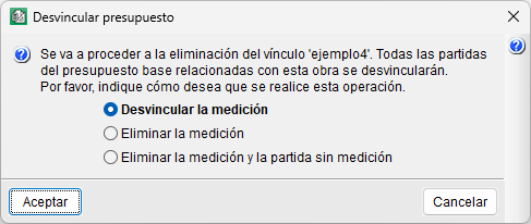 Además de eliminar la referencia y la posibilidad de actualizar (opción Desvincular la medición), también se eliminan los detalles de la medición relativos al presupuesto seleccionado. Sin embargo, no se alteran los detalles de otros presupuestos que pudieran estar vinculados ni los detalles no vinculados. En ningún caso se eliminará la partida, aunque el total de la medición resultase nulo. - Eliminar la medición y la partida sin medición