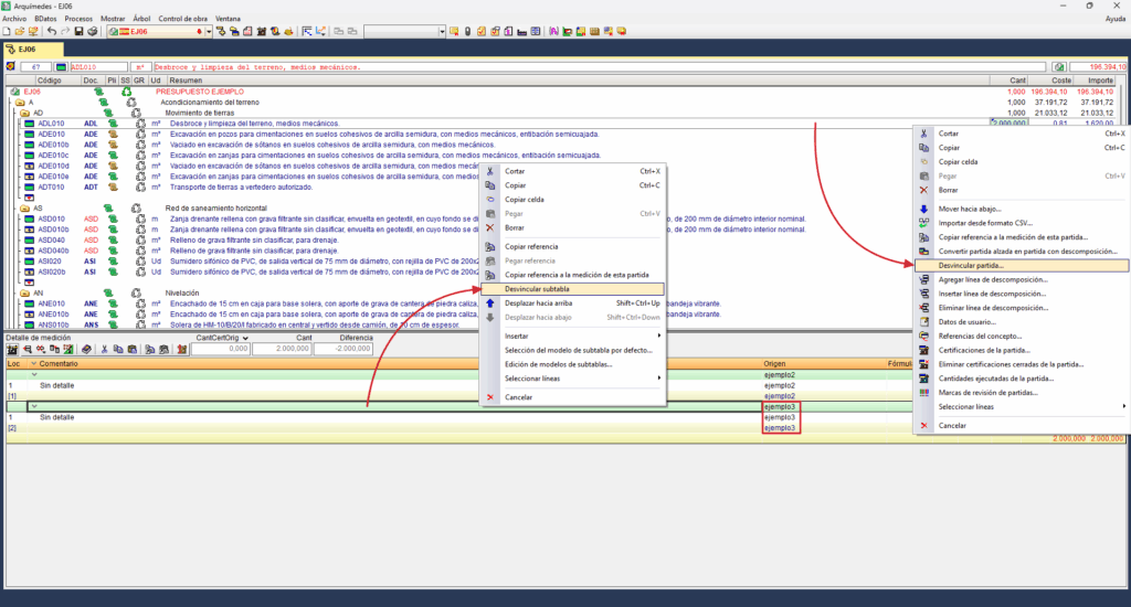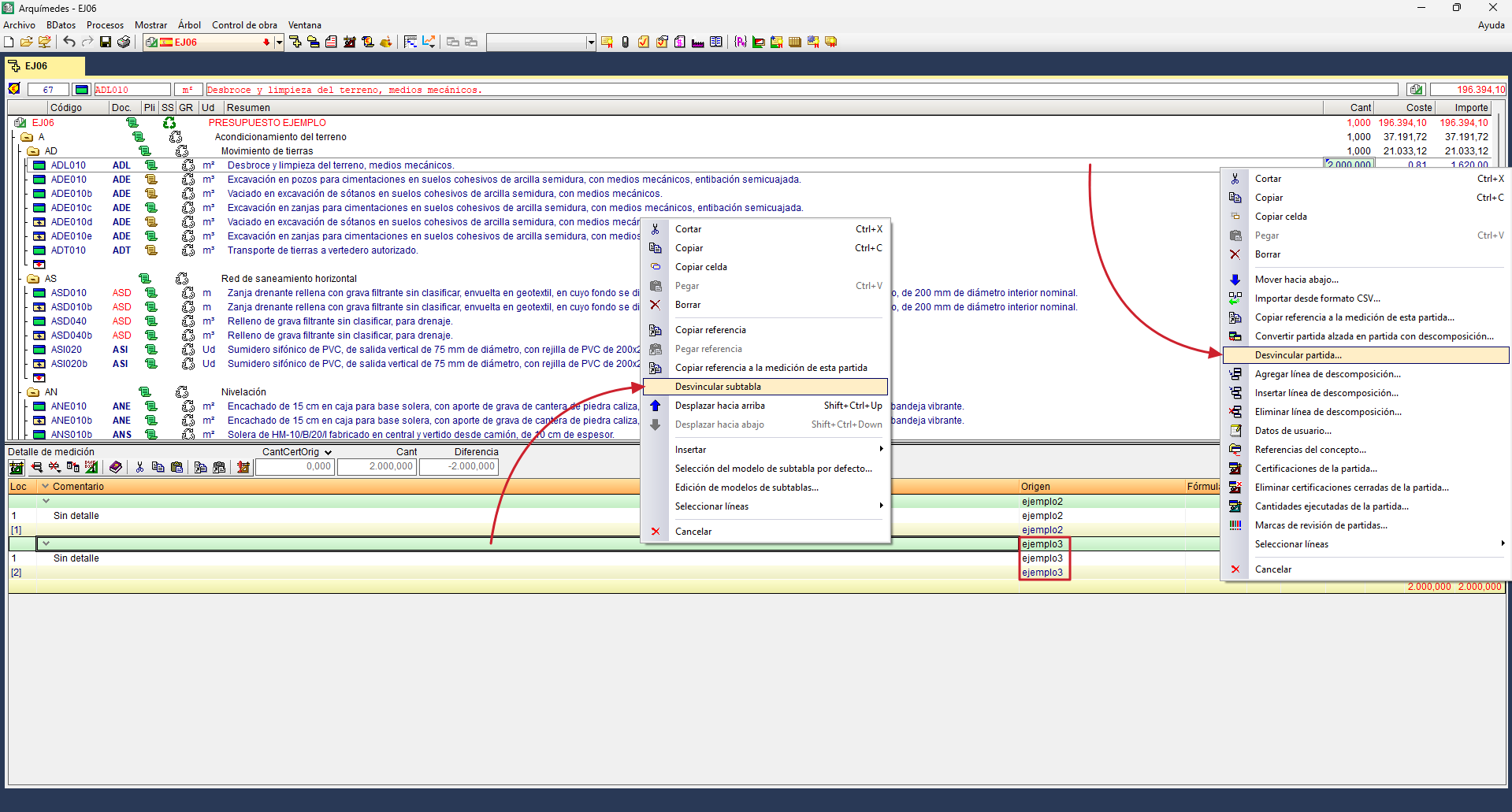 Si en la ventana "Árbol de descomposición" se selecciona, con el botón derecho del ratón, una unidad de obra que esté vinculada a uno o más presupuestos, aparece un menú contextual que contiene, entre otras, la opción "Desvincular partida". La selección de esta opción elimina todos los vínculos que la unidad de obra elegida tenga con otros presupuestos y, también, la referencia a cada uno de ellos que existe en cada subtabla de medición. No se elimina la unidad de obra ni su medición. - Eliminación de la vinculación de una unidad de obra a uno de los presupuestos a los que esté vinculada
