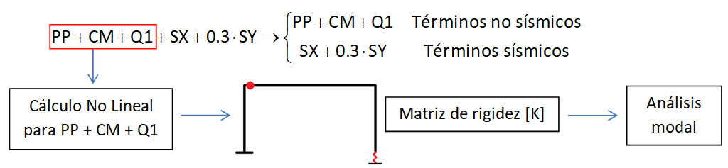 Al tener una combinación no lineal que incluye hipótesis sísmicas automáticas (modal espectral), hay que fijarse en los términos no sísmicos de la misma. El programa realiza un análisis no lineal de la estructura sometida a las cargas de esa parte no sísmica de la CNL. Llegado al último escalón de carga, se analiza el comportamiento de los elementos no lineales y se estudia si las no linealidades se activan o no y, en el caso de las rótulas plásticas, en qué estado trabajan. Reemplaza los elementos no lineales por su elemento lineal equivalente, y obtiene un modelo "linealizado" equivalente, que es el modelo de partida para el análisis modal que proporciona la matriz de rigidez que se necesita.