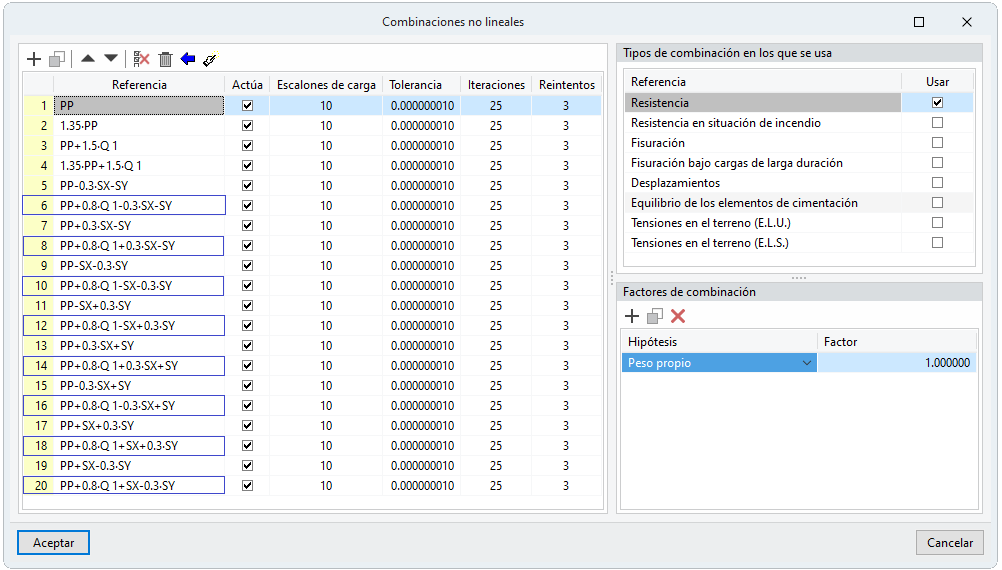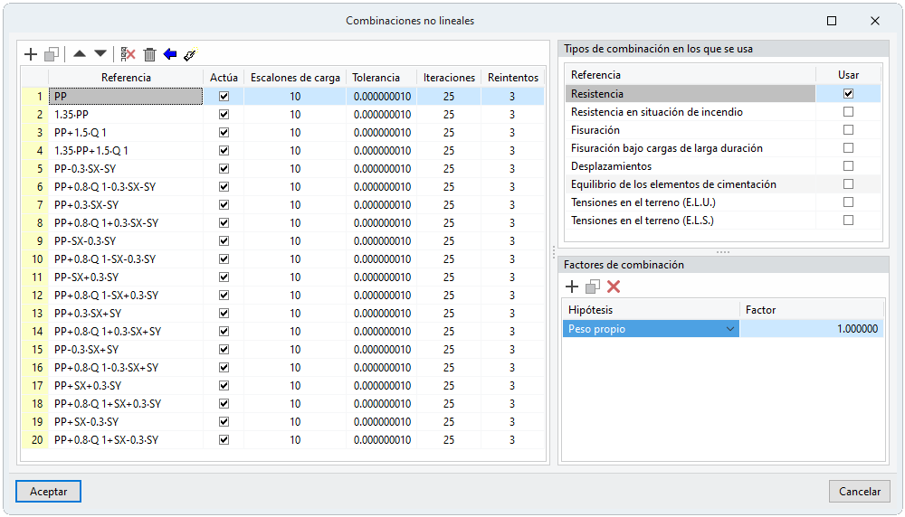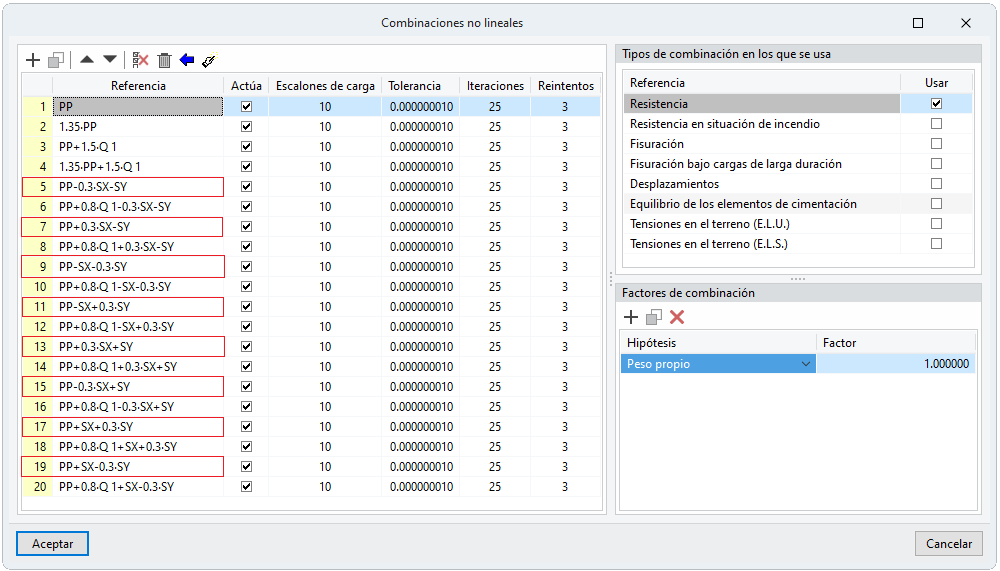 En el primer grupo de combinaciones, teniendo en cuenta únicamente los términos no sísmicos, solamente actúa el peso propio con un coeficiente de combinación de 1.